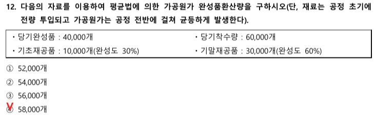 👉 가공원가 완성품 환산량 : 당기완성품 40,000개 + 기말재공품 30,000개 X 60%(완성도) = 58,000개