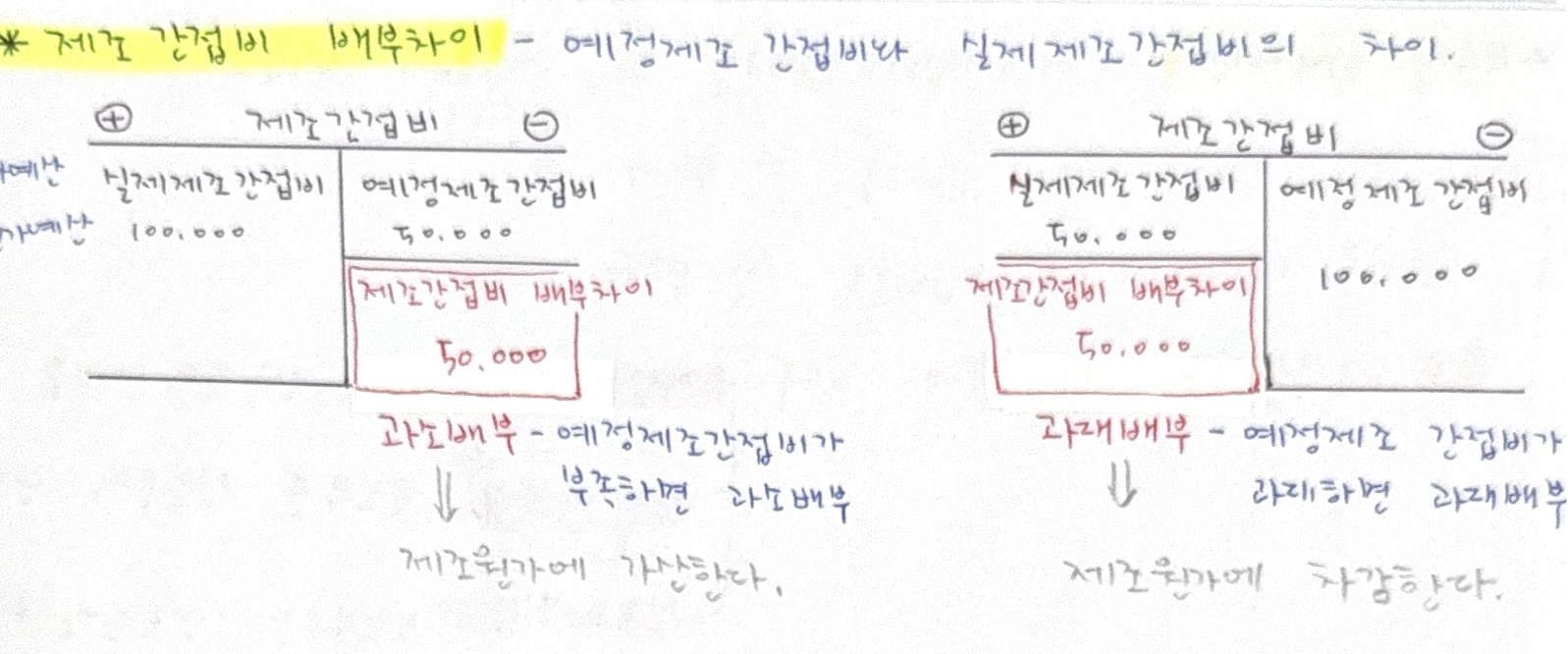 - 원가차이 분석 문제 (예산 vs 실제) : 실제 < 예정 (과대배부)의 개념을 T계정을 그려서 이해하세요.