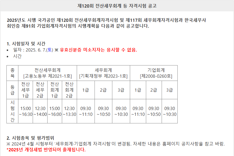 시험 과목은 기존과 동일하지만, 실무 영역의 출제 기준이 120회 차에는 2025년 세무회계 개정세법이 적용되어 출제됩니다.